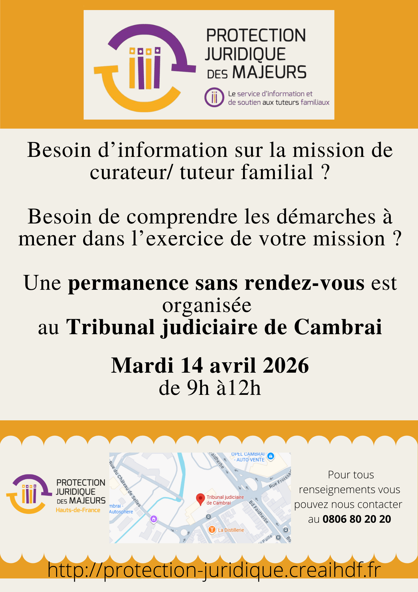 Le Service d’Information et de Soutien aux Tuteurs Familiaux vous propose des permanences ponctuelles sans rendez-vous, organisées au tribunal judiciaire de Cambrai.